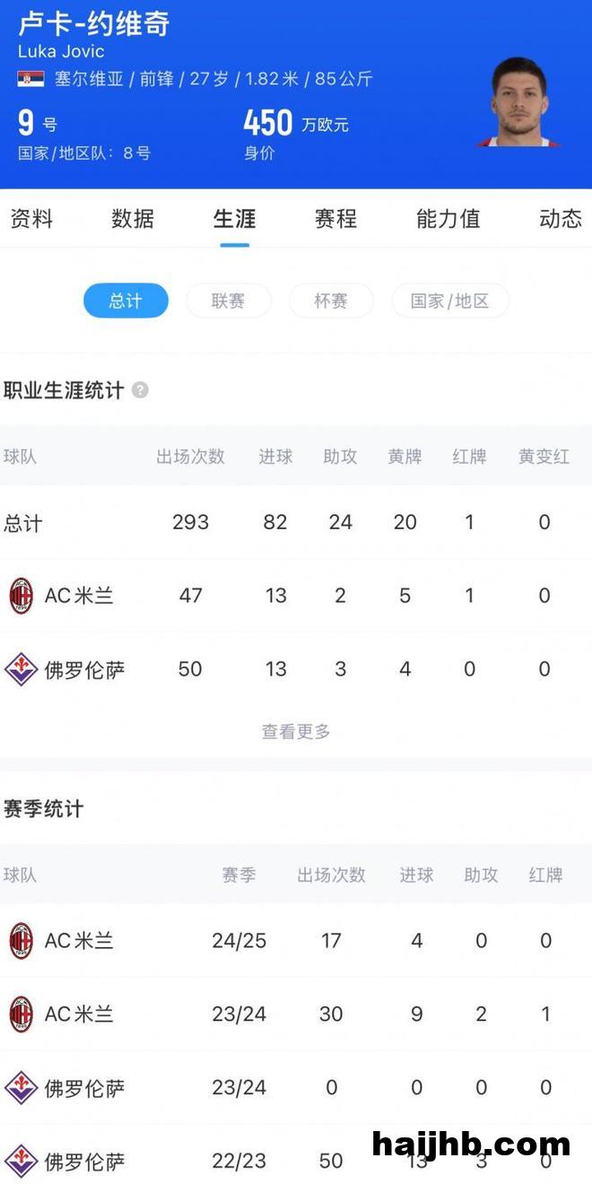 2023年夏窗,米兰花费50万欧元的转会费,从佛罗伦萨签下约维奇。27岁的约维奇本赛季为米兰出场17次打进4球。球员德转身价仅为450万欧,他巅峰时曾达到过6000万欧。