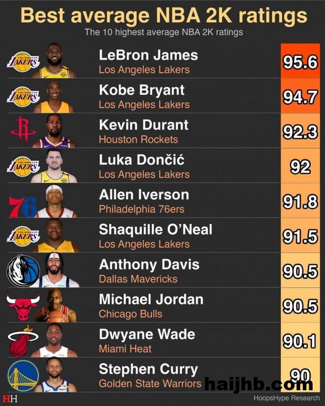 直播吧8月23日讯 今日美媒HoopsHype晒出NBA球员2K历史平均评分最高的10位球员,具体如下: