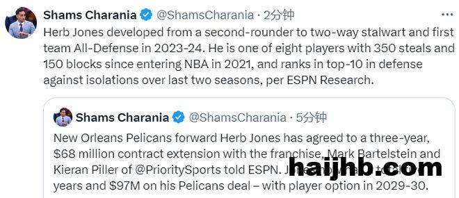 北京时间7月11日,据名记Shams报道,新奥尔良鹈鹕队前锋赫伯-琼斯已与球队达成一份三年6800万美元的续约合同。目前,琼斯与鹈鹕队的合同总时长为五年,总金额达9700万美元,其中2029-30赛季是球员选项。