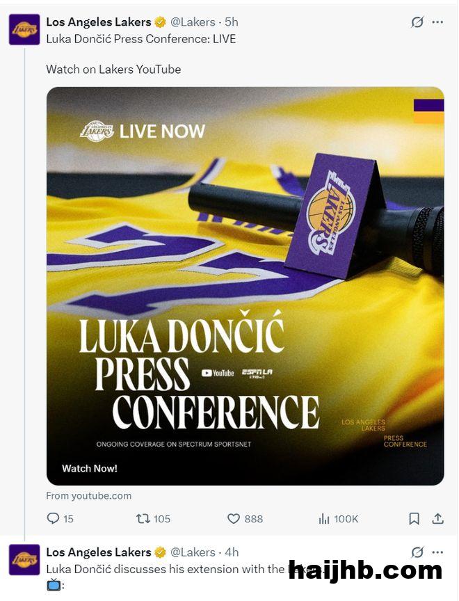 湖人官方还预热了东契奇的续约新闻发布会,还给了全世界球迷直播链接。