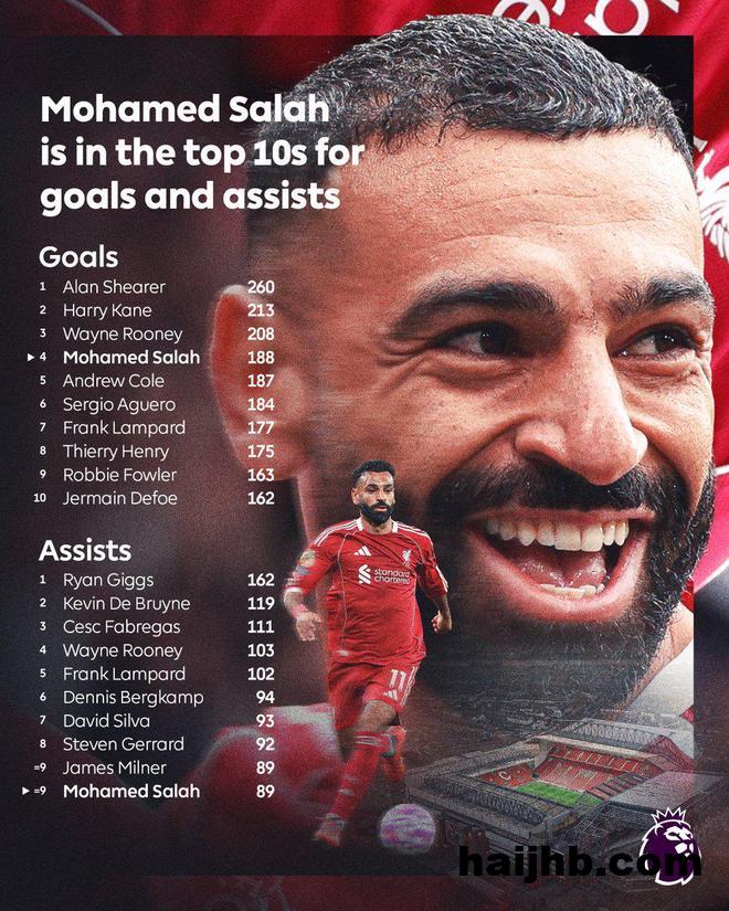 目前,萨拉赫同时跻身英超历史进球和助攻榜前十。