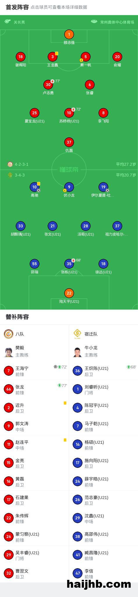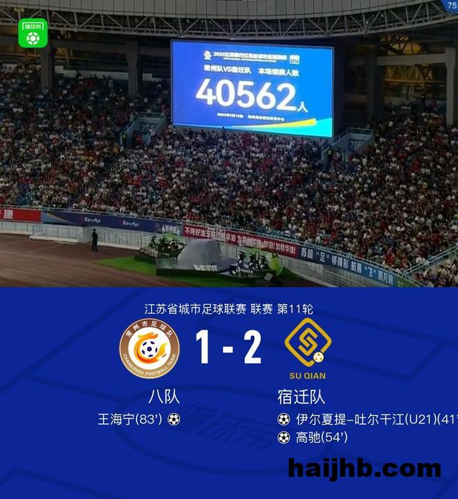 江苏省城市足球联赛第11轮,常州队主场迎战宿迁队。比赛中,宿迁队的伊尔夏提-吐尔干江率先取得进球,随后高驰扩大比分,常州队由王海宁扳回一城。最终,常州队以1比2不敌宿迁队。