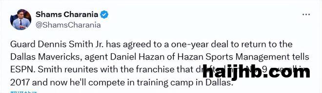 北京时间9月19日,据名记Shams报道,后卫小丹尼斯-史密斯已同意与达拉斯独行侠队签下一份为期一年的合约,重返老东家效力。