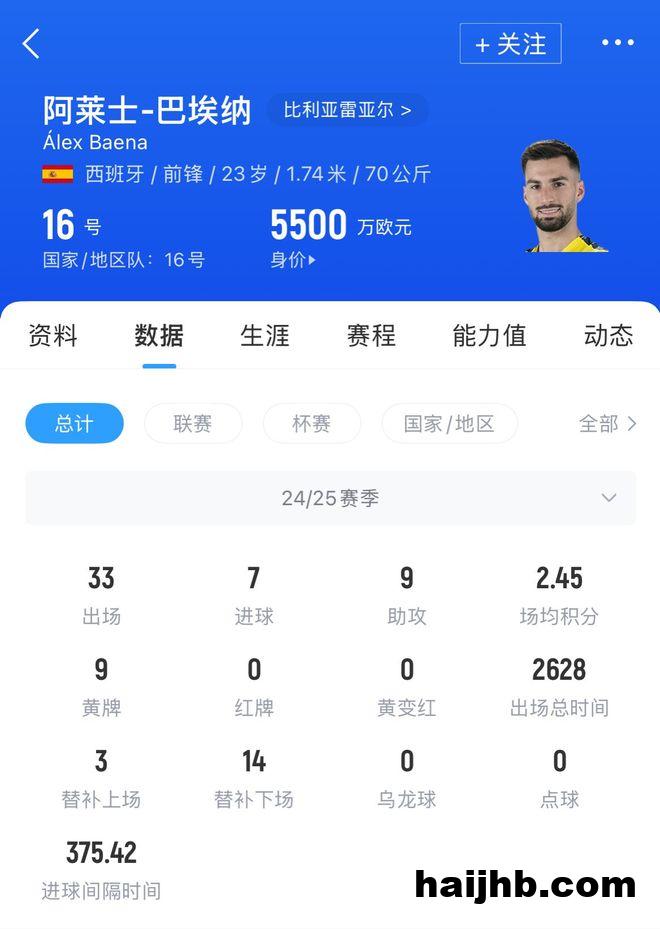 23岁的巴埃纳司职中场,德转身价5500万欧,24/25赛季代表黄潜出战33场比赛,贡献7球10助攻。