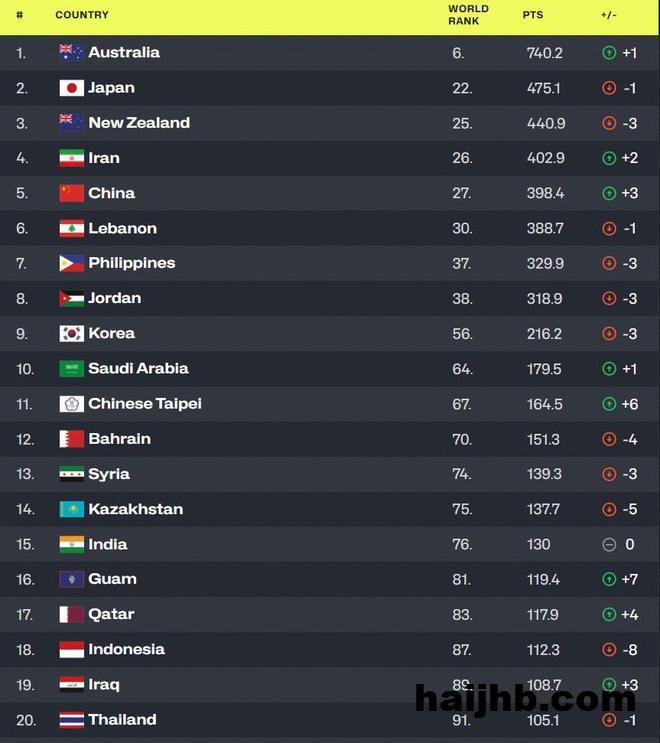 中国男篮在拿到亚洲杯亚军之后,排名上升了3位。目前在世界排名第27,亚洲排名第5,落后于澳大利亚、日本、新西兰和伊朗。