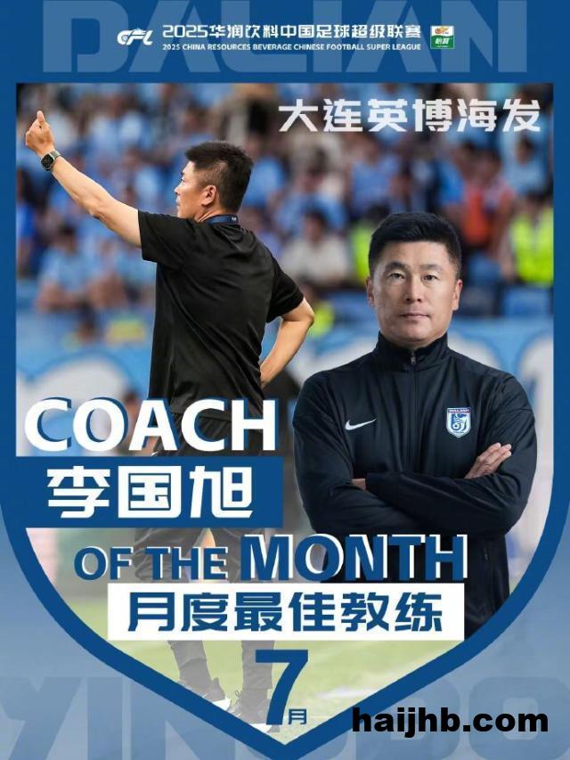 8月14日,中超官方公布了2025赛季中超联赛7月最佳教练,大连英博主教练李国旭当选。
