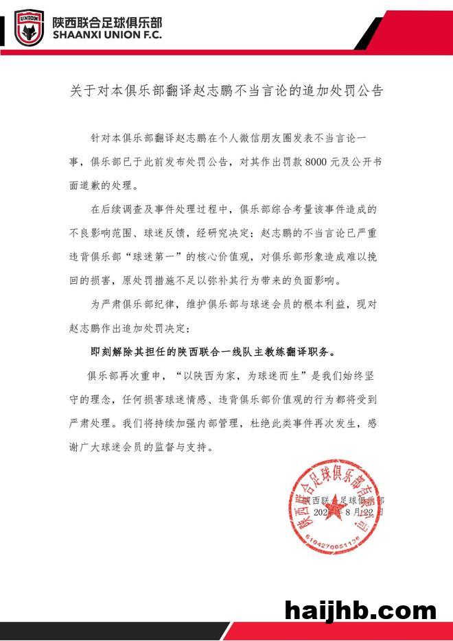 8月22日晚,陕西联合足球俱乐部官方发布公告,对该俱乐部的翻译员赵志鹏解除职务。