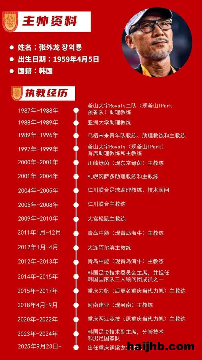 张外龙教练拥有丰富的执教履历,曾率领仁川联合在2005年获得K联赛亚军,其本人也当选为韩国年度最佳教练。除了在韩国和日本执教多家俱乐部取得优异成绩以外,张外龙教练与中国也有深厚的感情,青岛、大连、河南、重庆都留有他的足迹,他还曾分别带领青岛中能和重庆当代力帆获得过中超第六名的成绩。