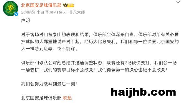 国安在声明中写道:“对于客场对山东泰山的表现和结果,俱乐部全体深感自责。俱乐部对所有关心爱护球队的人,郑重地说声对不起。经历大比分失利,我们和每一位深爱北京国安的人一样感到耻辱、夜不能寐。”