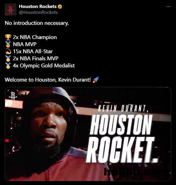 火箭官方写道: 无需过多介绍。 两届NBA总冠军 1次NBA常规赛最有价值球员 十五次入选NBA全明星 两次NBA总决赛最有价值球员 四枚奥运金牌得主 欢迎来到休斯敦,凯文-杜兰特! 好博体育新闻中心 好博体育(中国)官方网站-HAOBO SPORTS新闻中心 姆总!队报:法国足协曾想与阿根廷进行友谊赛,被姆巴佩劝退 时任意足协主席谈电话门:剥夺尤文意甲冠军合理,但不该授予国米