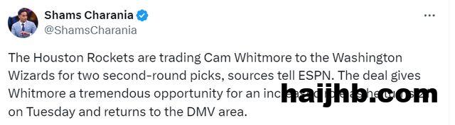 北京时间7月6日,据名记Shams报道,火箭队已同意将前锋卡姆-惠特莫尔交易至奇才队。Shams透露,火箭将换回两个次轮选秀权作为回报。后续报道更新,这两个次轮是2026年公牛的次轮签和2029年国王的次轮签。