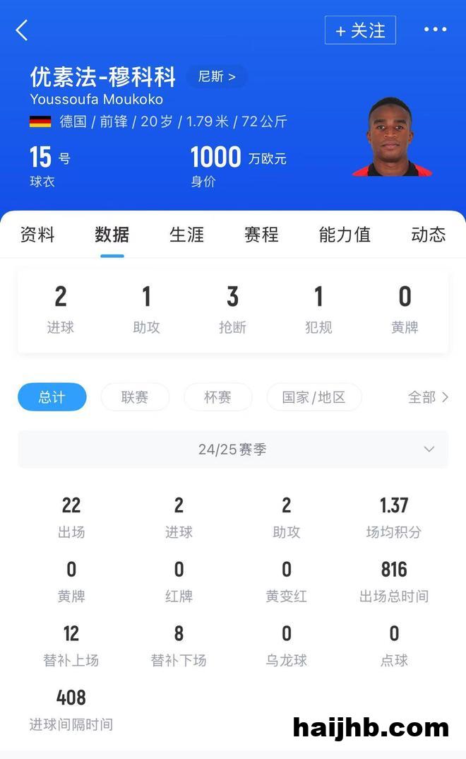 球员上赛季被多特租借至法甲球队尼斯,出场22次贡献2球2助,目前球员德转身价为1000万欧元。穆科科与多特当前的合同2026年夏天到期。