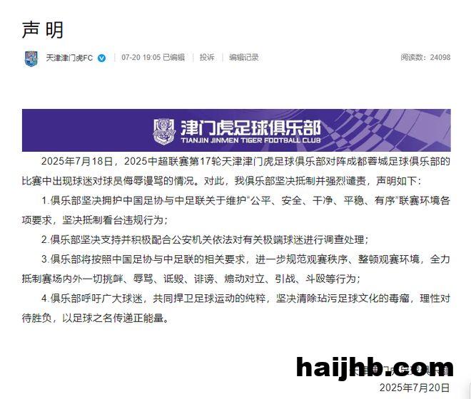 19时15分左右,津门虎俱乐部在声明中表示,“2025年7月18日,2025中超联赛第17轮天津津门虎足球俱乐部对阵成都蓉城足球俱乐部的比赛中出现球迷对球员侮辱谩骂的情况。对此,我俱乐部坚决抵制并强烈谴责,声明如下:1.俱乐部坚决拥护中国足协与中足联关于维护公平、安全、干净、平稳、有序联赛环境各项要求,坚决抵制看台违规行为;”