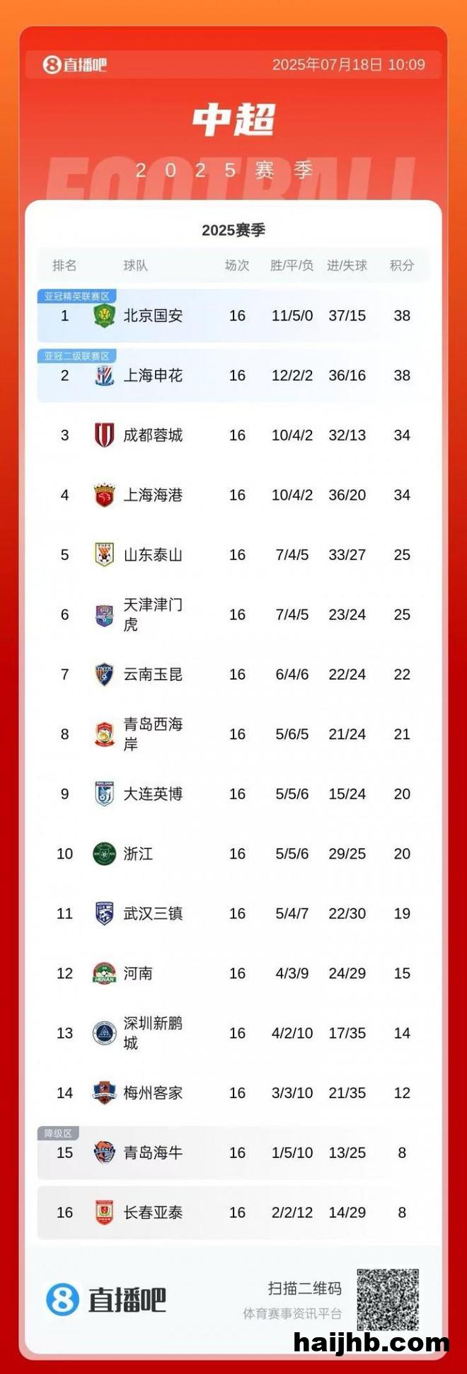 当前中超前16轮战罢,北京国安与上海申花同积38分分列中超第1/2名。