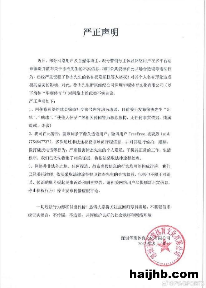 对其个人名誉形象造成极其恶劣的影响。对此,徐杰先生所属经纪公司深圳华璨体育文化有限公司(以下简称“华璨体育”)对网络上的此类不实言论,严正声明如下: