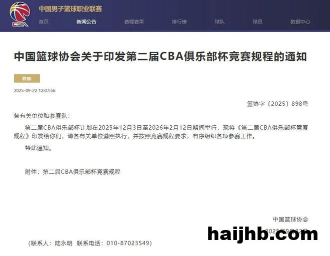 由于要为全运会让路,25-26赛季的CBA联赛开赛时间比较晚,据悉要到12月12日才会正式开打。由于时间变动比较大,篮协方面也对杯赛时间进行了调整,小组赛阶段被安排在了新赛季前进行。就在刚刚,篮协方面发布了《中国篮球协会关于印发第二届CBA俱乐部杯竞赛规程的通知》,详细介绍了今年CBA俱乐部杯赛事的安排。和去年的俱乐部杯相比,今年最大的一个变化就是进行了扩军,在NBA联赛中排名前四的球队将会参赛。