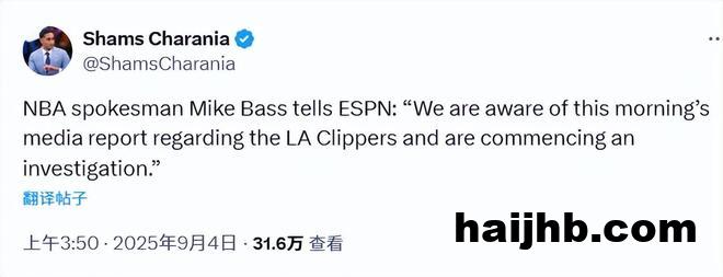 北京时间9月4日,据ESPN名记Shams报道,NBA发言人迈克-巴斯向其表示,联盟“已知晓有关洛杉矶快船队的媒体报道,并已启动调查”。据此前报道,快船队及其老板鲍尔默被指控通过向莱昂纳德支付2800万美元“挂名工作”报酬,以此规避NBA的工资帽规定。