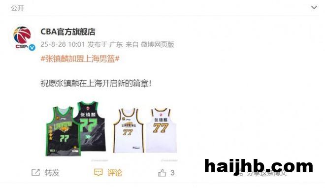 直播吧8月28日讯 CBA官方旗舰店更新官博,晒出了张镇麟的辽篮球衣图。 “祝愿张镇麟在上海开启新的篇章。”CBA官方旗舰店官博在图片旁边写道。 好博体育新闻中心 好博体育(中国)官方网站-HAOBO SPORTS新闻中心 斯基拉:邓弗里斯将缺阵至明年3月初,国米已开始找寻替代者 国际米兰巴西最佳阵容发布!马克斯维尔 胡安落选!能否打穿意甲