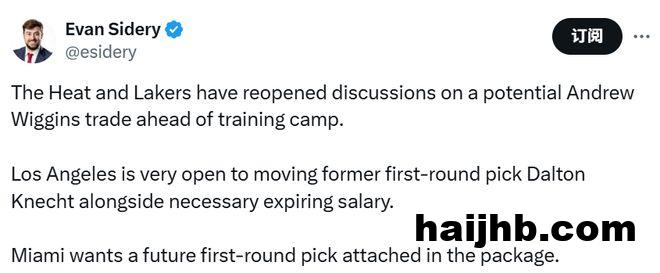 北京时间9月14日,据名记Evan Sidery透露,湖人和热火已经在训练营开始前重启了关于维金斯的交易谈判。湖人非常愿意送走前首轮秀克内克特,同时搭配一些到期合同。热火则想要在交易回报中添加一个未来的首轮签。