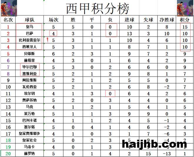 积分榜方面,皇马5战全胜,继续稳稳领跑,先赛的他们领先巴萨5分。西班牙人赛季首败,被比利亚雷亚尔以净胜球优势超过,黄潜则是差巴萨4个净胜球,暂时排在第3。毕尔巴鄂竞技遭遇2连败,排名再往下跌,排在第7,塞维利亚倒是追了上来,排在毕尔巴鄂竞技之后位列第8。