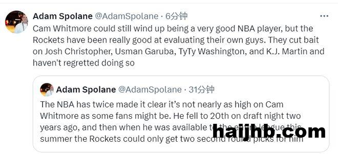 火箭队记Spolane表示:“NBA联盟已两次明确表明,他们对惠特莫尔的评价远不及部分球迷那般高。两年前的选秀夜,他一路跌至第20顺位;而今年夏天,当他被摆上货架时,火箭队也仅能为他换回两个次轮签。惠特莫尔或许仍能成长为一名非常出色的NBA球员,但火箭队在评估自家球员方面向来眼光独到。他们当初果断放弃乔克里斯托弗、加鲁巴、泰泰-华盛顿和KJ-马丁,事后也从未后悔过。”