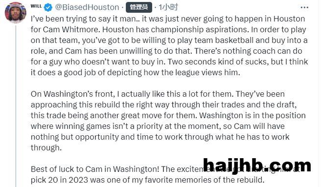 火箭媒体人Will则表示,无论换来的回报如何,送走惠特莫尔是火箭不得不做出的决定。他写道——