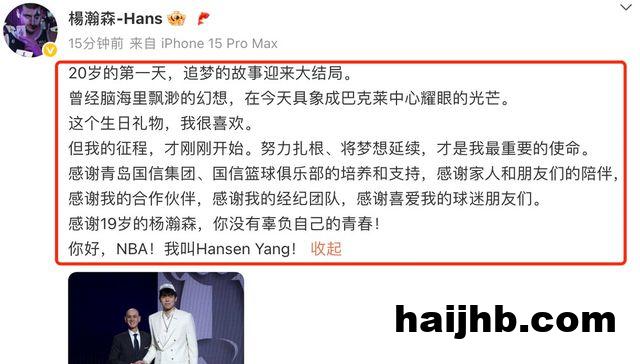 杨瀚森本人对于成为首轮第16顺位也很满意,他本人发声说:“20岁的第一天,追梦的故事迎来大结局。曾经脑海里飘渺的幻想,在今天具象成巴克莱中心耀眼的光芒。这个生日礼物,我很喜欢。但我的征程,才刚刚开始。努力扎根、将梦想延续,才是我最重要的使命。感谢青岛国信集团、国信篮球俱乐部的培养和支持,感谢家人和朋友们的陪伴,感谢我的合作伙伴,感谢我的经纪团队,感谢喜爱我的球迷朋友们。感谢19岁的杨瀚森,你没有辜负自己的青春!你好,NBA!我叫Hansen Yang!”