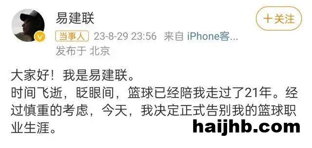 2023年8月29日晚,易建联发布微博,决定正式告别篮球职业生涯。