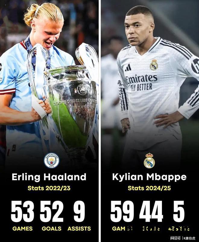 哈兰德在曼城的首个赛季与姆巴佩在皇马的首赛季数据对比