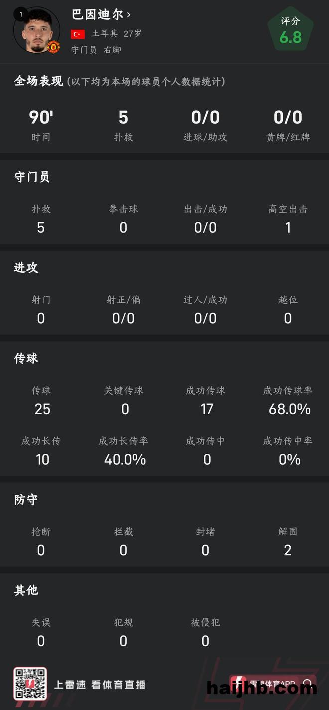 雷速体育9月27日讯 英超联赛第6轮,曼联虽客场1-3不敌布伦特福德,但曼联门将巴因迪尔在此役的发挥仍旧是可圈可点。如若不是巴因迪尔多次神扑救险,曼联恐早早崩盘。