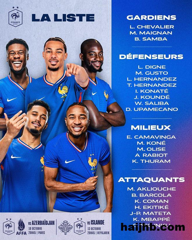 雷速体育10月2日讯 法国公布最新一期大名单,姆巴佩领衔,巴尔科拉、埃基蒂克在列,登贝莱伤缺。