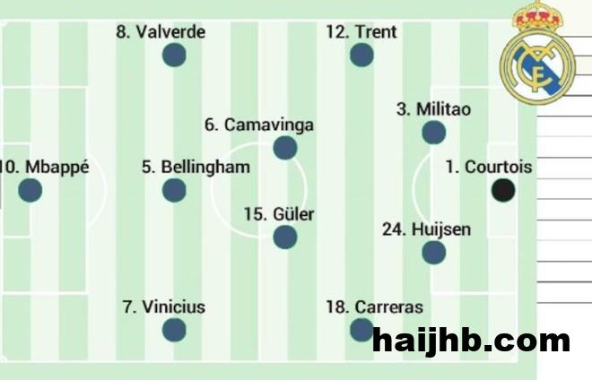 库尔图瓦;亚历山大-阿诺德、米利唐、赫伊森、阿尔瓦罗-卡雷拉斯;卡马文加、居莱尔;巴尔韦德、贝林厄姆、维尼修斯;姆巴佩