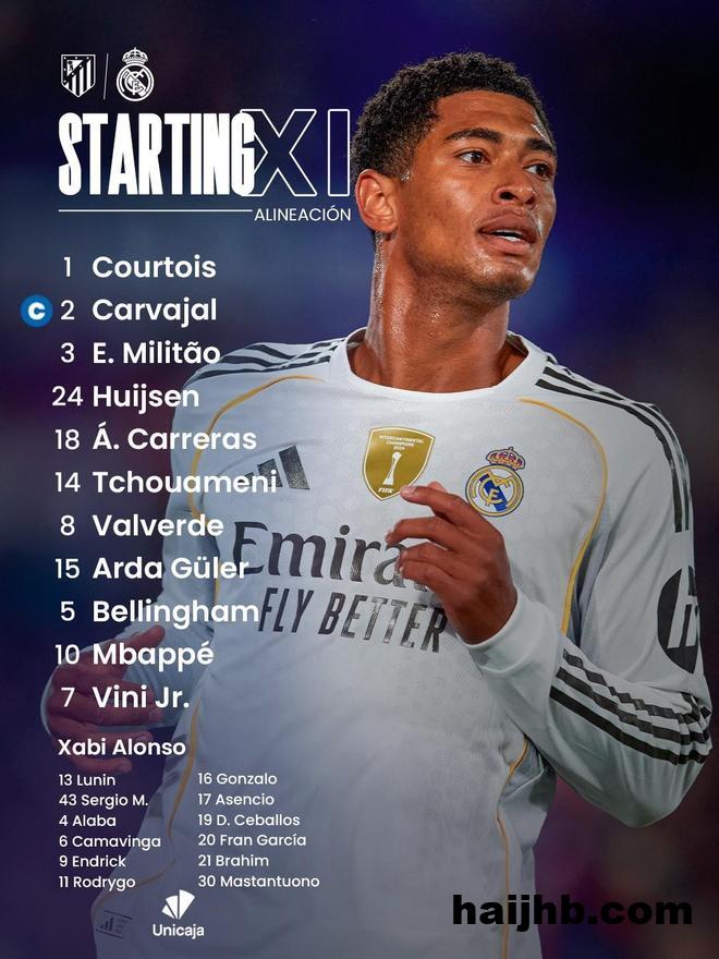 皇马首发:1-库尔图瓦、18-卡雷拉斯、24-赫伊森、3-米利唐、2-卡瓦哈尔、5-贝林厄姆、14-楚阿梅尼、8-巴尔韦德、7-维尼修斯、10-姆巴佩、15-居莱尔