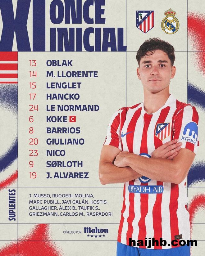 北京时间9月27日22点15分,西甲第7轮马竞坐镇主场迎战皇马,双方赛前公布首发名单。