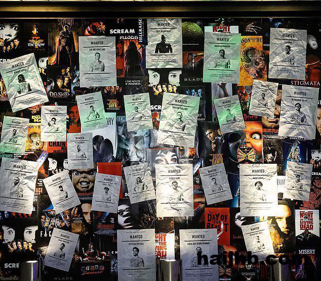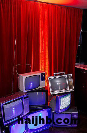 内部,一堆老式电视机在红色的灯光下闪烁,墙上贴满了“通缉令”海报