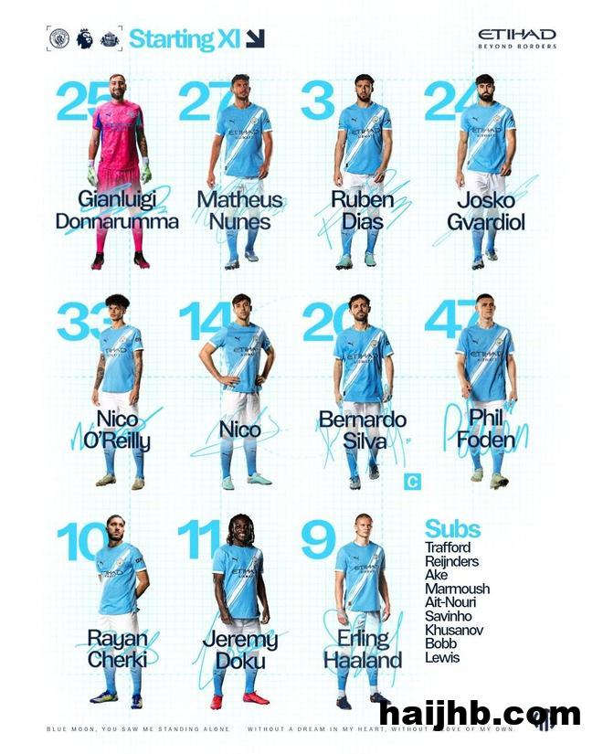 曼城首发:25-多纳鲁马、27-努内斯、3-鲁本-迪亚斯、24-格瓦迪奥尔、3-尼科-奥赖利、14-尼科-冈萨雷斯、20-伯纳多-席尔瓦、47-福登、10-谢尔基、11-多库、9-哈兰德