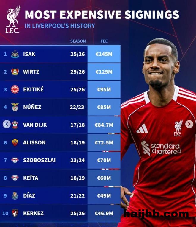 直播吧9月2日讯 利物浦压哨签下今夏标王伊萨克,《转会市场》也统计了红军队史最贵买人情况,前三均为今夏新援。