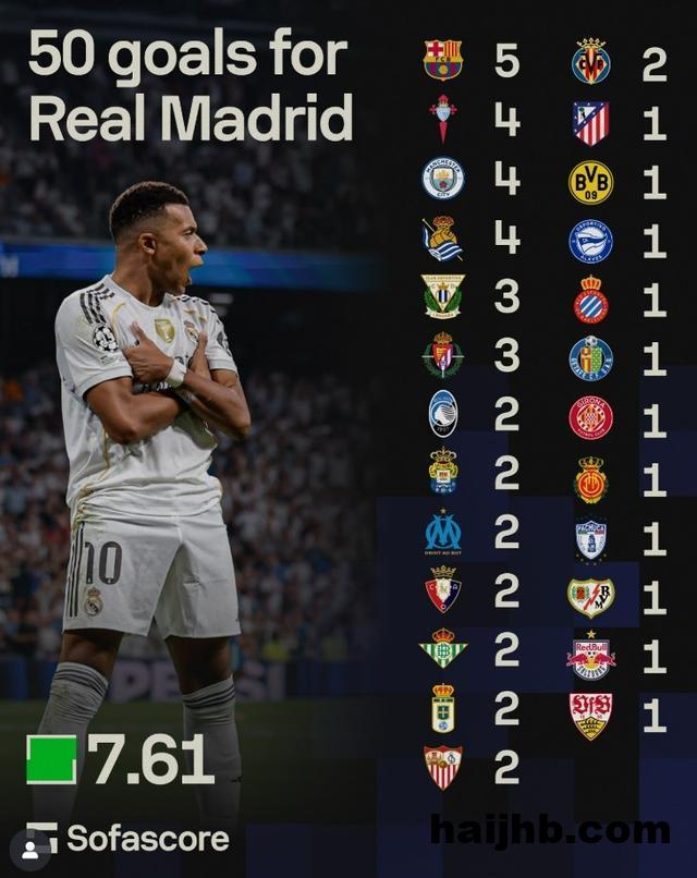 Sofascore也盘点了姆巴佩皇马生涯50球的分布,其中对阵巴萨打进5球最多,对阵曼城、塞尔塔、皇家社会均是打进4球,对阵巴拉多利德、莱加内斯打进3球,此外对阵亚特兰大等球队打进2球。