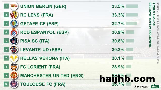 另一个榜单是最热衷转换进攻的球队,虽然转换进攻与传统的防守反击并不能完全划等号——转换进攻强调由守转攻的过程,但不一定是消极蹲守,也可以是阵型前压,在中前场就展开逼抢。但总的来说,防守反击也属于转换进攻,而我们也可以看到这个榜单前十几乎一水是各联赛的中下游球队,唯独排名第九的曼联成了豪门“显眼包”。当然,战术本无高低优劣之分,黑猫白猫,能抓老鼠就是好猫。朗斯目前法甲第三(上赛季第八),靠的是联赛防守第二好的表现,相比同分的马赛他们进球不多,反而是错失进球机会的数据法甲第一,这也说明了他们的确通过转换进攻获得了大量机会。