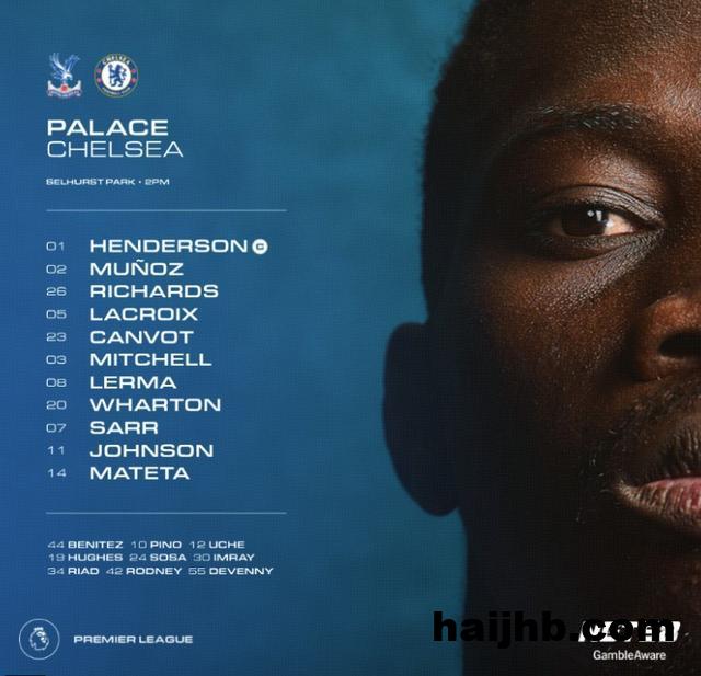 水晶宫首发:1-亨德森、23-康沃、3-米切尔、26-理查兹、5-拉克鲁瓦、2-穆尼奥斯、20-沃顿、8-莱尔马、11-约翰逊、7-萨尔、14-马特塔