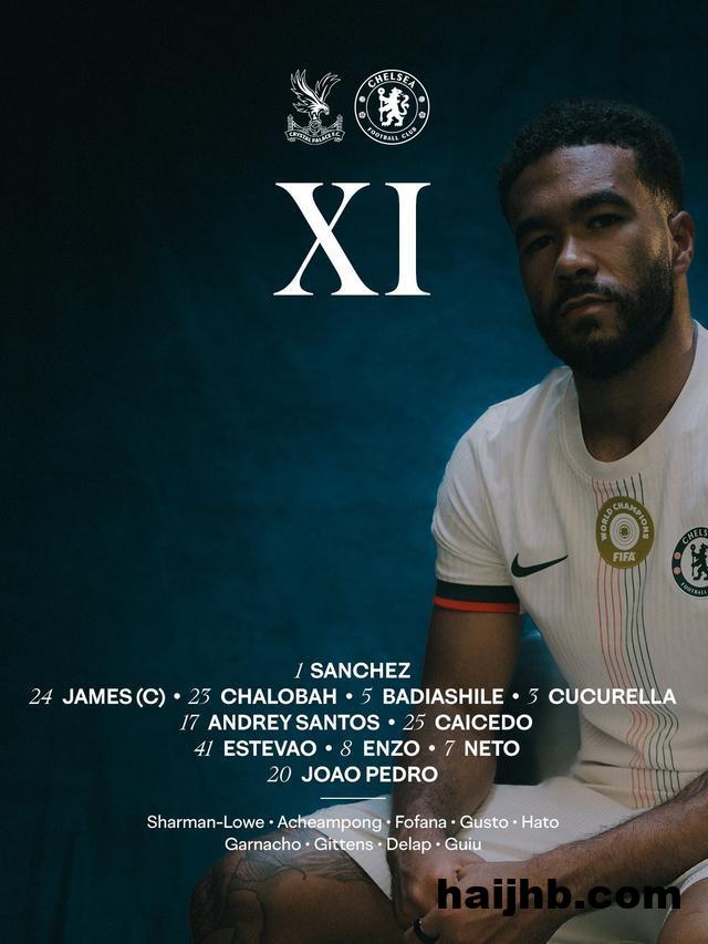 切尔西首发:1-桑切斯、5-巴迪亚西勒、24-詹姆斯、23-查洛巴、3-库库雷利亚、17-桑托斯、25-凯塞多、8-恩佐、41-埃斯特旺、20-佩德罗、7-内托