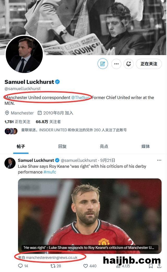 卢克赫斯特的个人账号简介已经改为:“太阳报曼联跟队记者,前曼晚首席曼联跟队。”