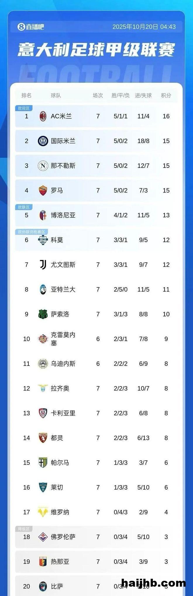 数据显示,米兰自2023/24赛季第8轮意甲之后,首次在单轮意甲赛事结束后独占榜首的位置。