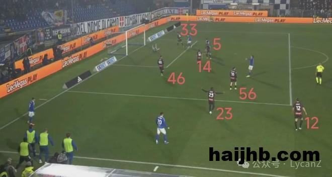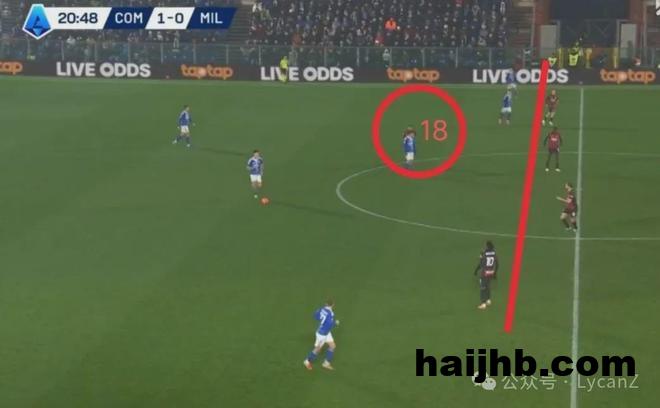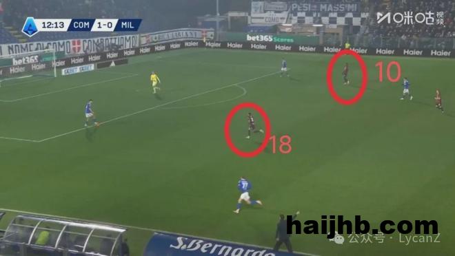 科莫一记斜传打向米兰的左路,靠着锋线两点压制米兰后卫,右后卫范德布雷普特拿球长驱直入畅通无阻并轻松起脚,莱奥换位在左路却没有起到相应的防守作用。直到第55分钟米兰2:1完成反超,阵型全面后撤收缩后,米兰10号才真正开始防守。