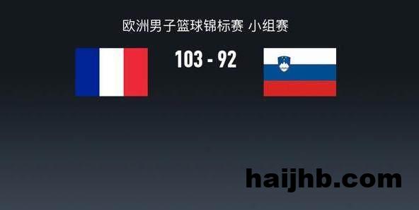 8月30日讯 欧洲男子篮球锦标赛 小组赛,法国男篮对阵斯洛文尼亚男篮。半场法国男篮47-54斯洛文尼亚男篮,最终法国男篮103-92斯洛文尼亚男篮。法国男篮法兰西斯高29分6板5助,埃利-奥科博14分1板5助;斯洛文尼亚男篮东契奇39分8板8助,穆里奇16分8板2助。